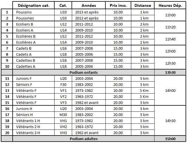La remise des prix aura lieu à 13h00 pour les catégories enfants et 14h45 pour les catégories adultes. Aucun prix ne sera envoyé aux concurrents non présents.